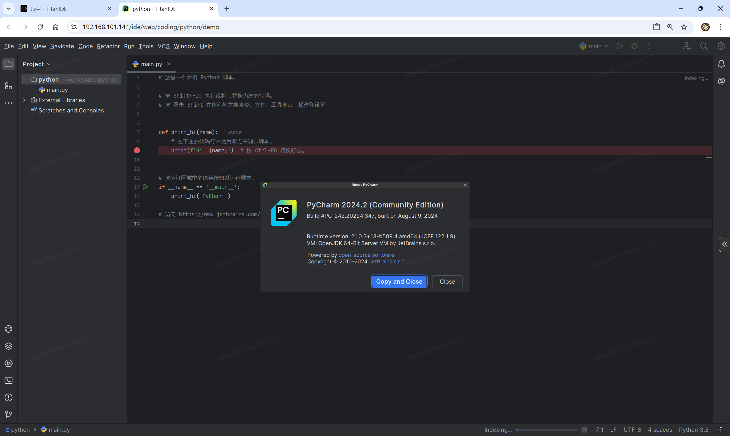 TitanIDE 是一款云端开发 IDE,以私有云方式部署于您企业的数据中心或是云,以浏览器作为客户端,以集约化共享云计算资源为底层依托,在云端运行的云原生集成开发环境,包括各种不同风格 IDE 内核实现编码和调试、开发空间和项目管理、应用端口映射、多租户、代码安全和审计、权限管理等功能。
