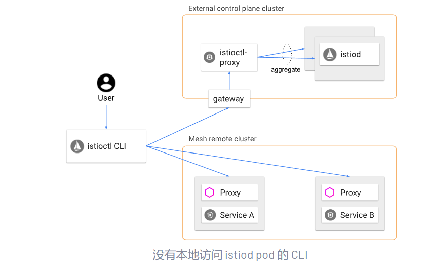 另一方面,当使用远程集群时,这是不可能的,因为 istiod 实例在网格集群之外运行,并且网格用户无法访问。这些实例甚至可能不会使用 Kubernetes 集群上的 Pod 进行部署。