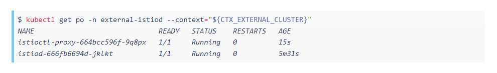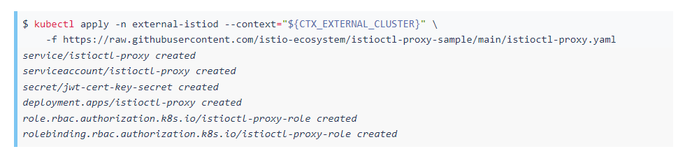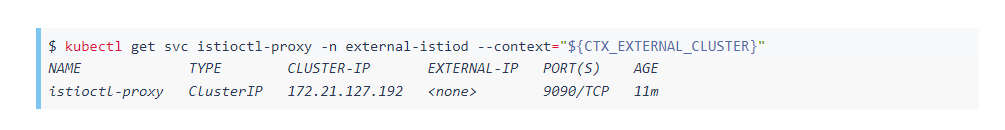 要进行配置,我们首先需要在正在运行的Podistioctl旁边部署代理服务。istiod在我们的安装中,我们已经在external-istiod命名空间中部署了控制平面,因此我们使用以下命令在外部集群上启动代理服务:
