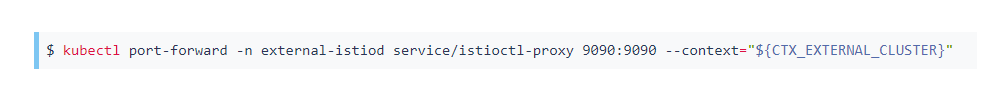 然而,在我们使用它之前,我们需要将它暴露在外部集群之外。有很多方法可以做到这一点,具体取决于部署环境。在我们的设置中,我们有一个在外部集群上运行的入口网关,因此我们可以更新它以公开端口 9090,更新关联的虚拟服务以将端口 9090 请求定向到代理服务,然后配置istioctl为使用网关地址代理服务。这将是一个“正确”的方法。