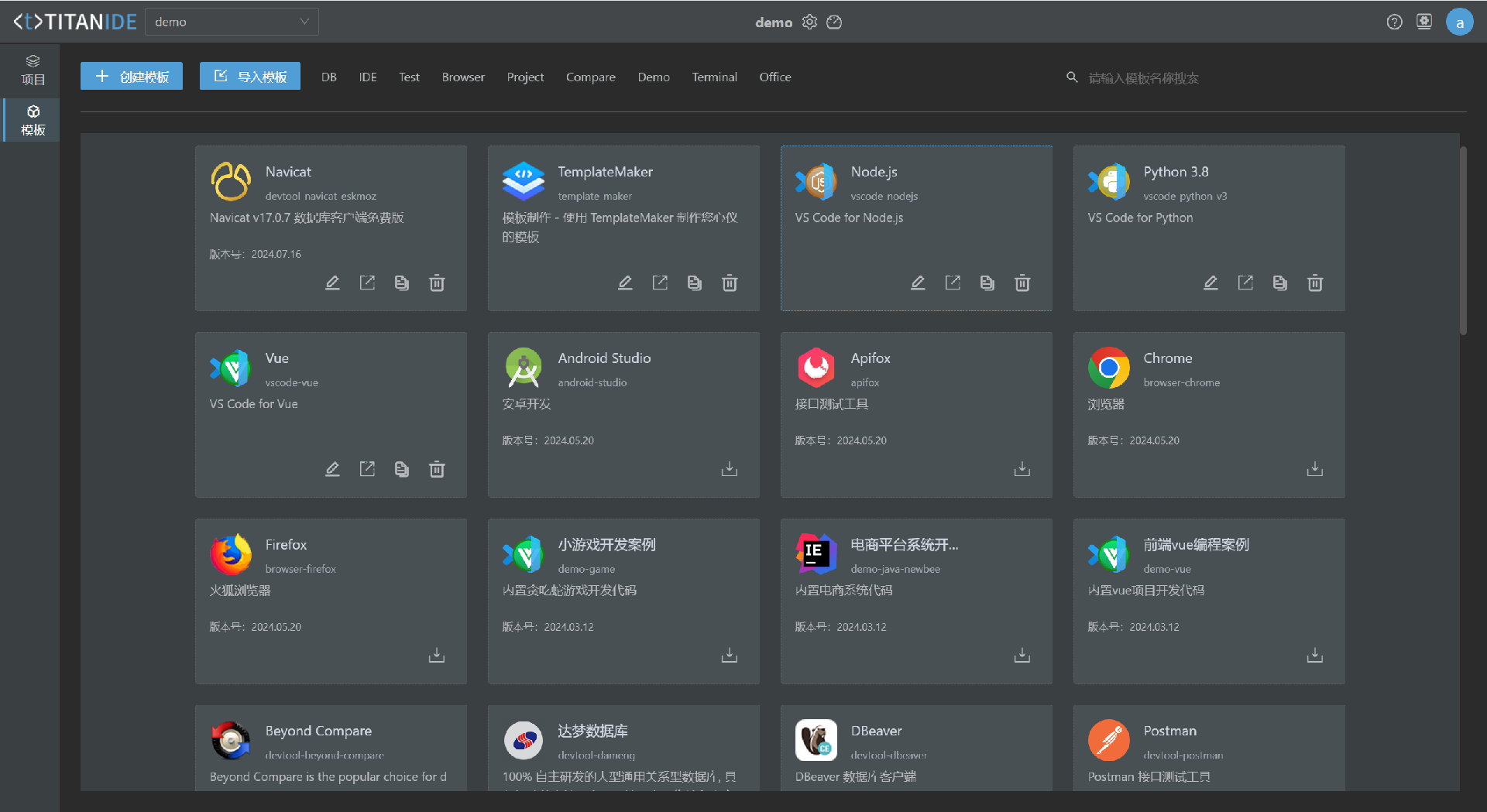 TitianIDE的开发环境模板把开发从作文题变成填空题,一键开启 Java业务开发、Python人工智能、Golang物联网的开发环境。
